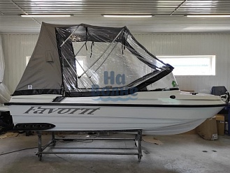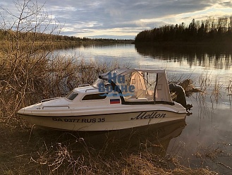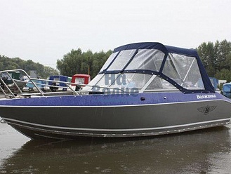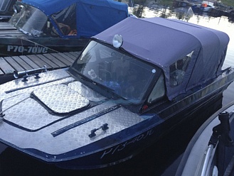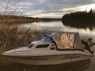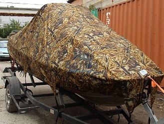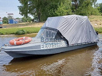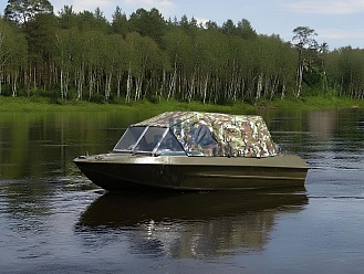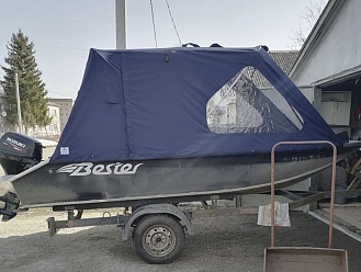 Тент с задней дверью для выхода к мотору, небольшими боковыми окнами и усиленными краями для установки застёжек. Изготовлен из специализированной тентовой ткани Оксфорд 600 повышенной плотности